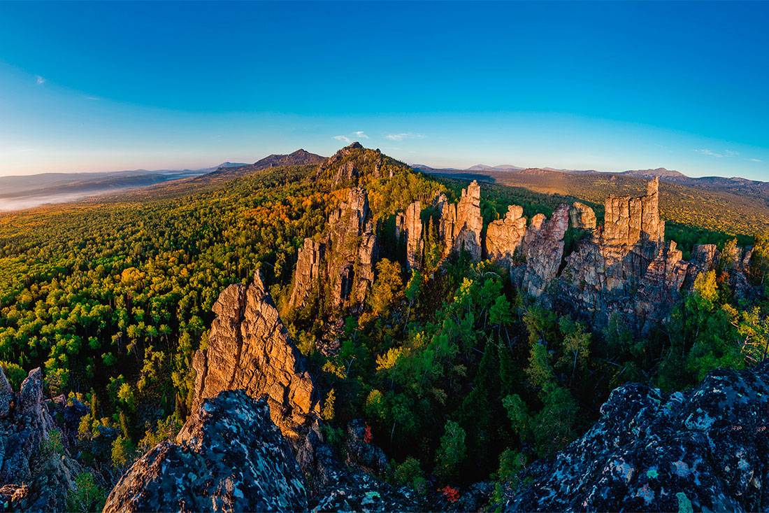 Со скальных зубцов открываются удивительной красоты виды на окрестности. На севере видны склоны хребта Малый Ямантау, справа от него – Большой Ямантау, также можно рассмотреть Синие скалы.