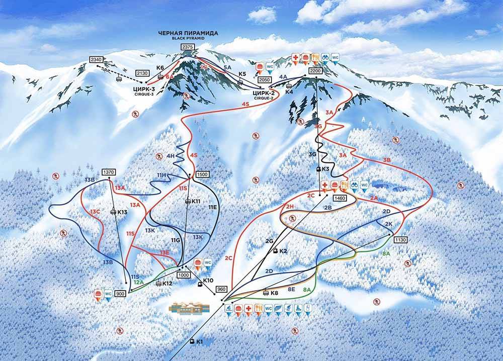 - Трассы: действуют 15 трасс, из которых 5 черных, 6 красных, 3 синих и 1 зеленая учебная.