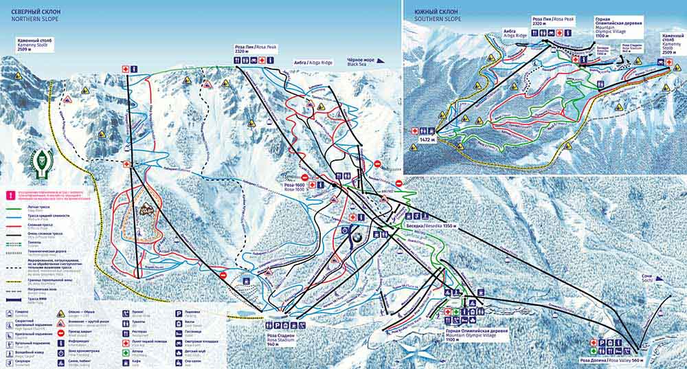 Схема трасс Роза Хутор покажет 35 маршрутов для катания. Среди них 5 зелёных трасс для новичков, по 20 штук синих и красных, а также крутые «чёрные» склоны для профессионалов. Чёрная трасса – непременный атрибут спортивного катания. Роза Хутор предлагает сразу 15 сложных и опасных спусков. Самая экстремальная трасса обозначена на карте пунктиром, проходит по целине и требует специального снаряжения. Открываются новые трассы и для любителей беговых лыж.