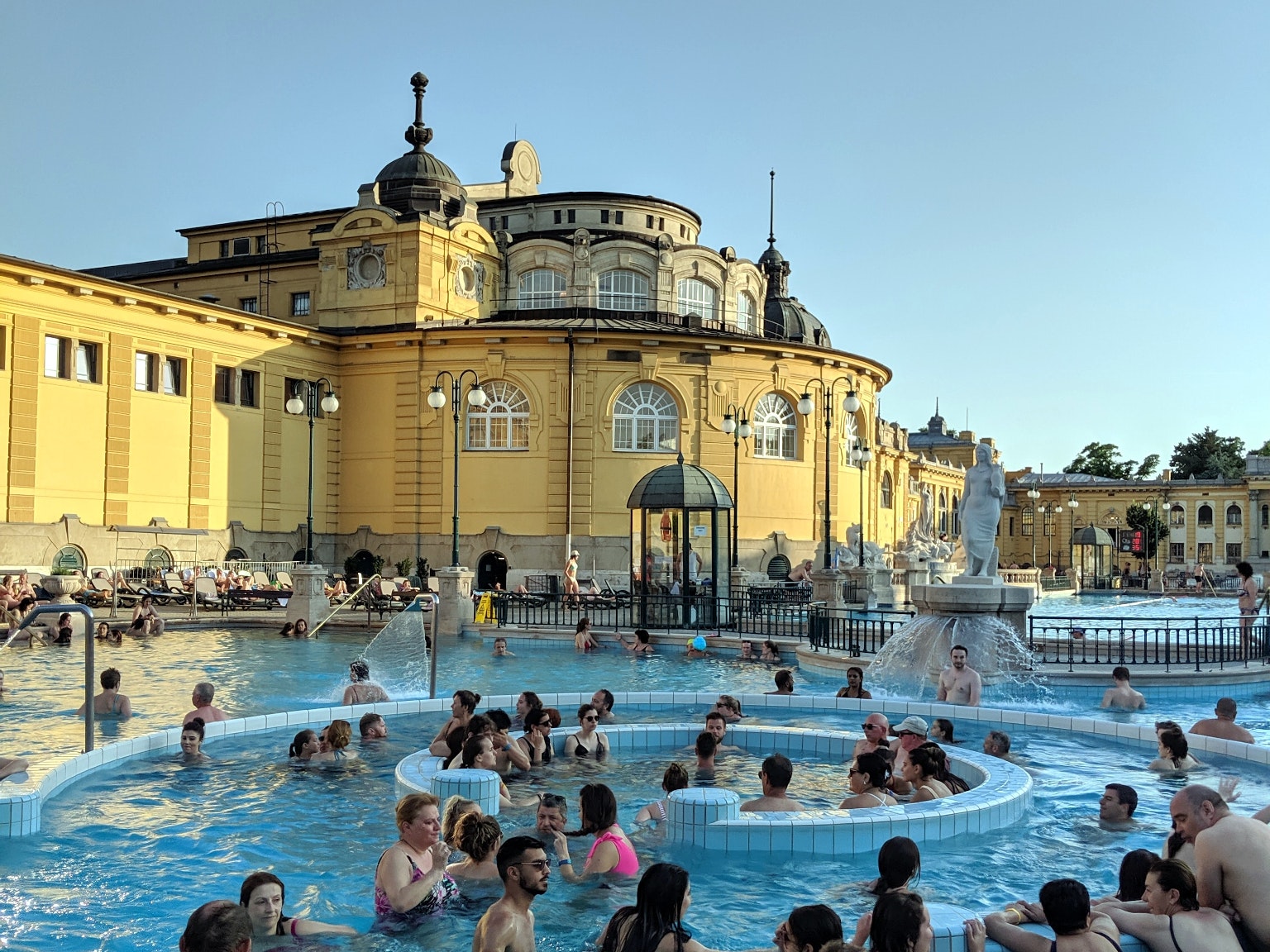 Лечебная купальня имени Сечени (Széchenyi fürdő) — первая и самая популярная купальня Будапешта. Здание в стиле необарокко было построено в 1909-1913 гг по проекту Дьёзё Циглера. Самый крупный банный комплекс Европы включает 21 бассейн, из которых 11 лечебных и 3 открытых. В «бассейне сюрпризов» течет медленная река, есть подводный массаж, водопад для шеи и струя для массажа спины.