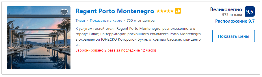 Одним из наиболее популярных пятизвездочных отелей в Черногории является отель Regent Porto Montenegro, расположенный в Тивате. Стоимость суток пребывания в этой гостинице стартует от 13050 рублей.