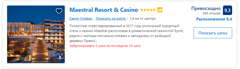 | Splendid Conference & SPA Resort 5* | Becici bb, г. Бечичи | Всего 324 номеров. Есть 3 ресторана, 6 баров, винный салон. Работает Wellness Center, фитнес-центр, 6 бассейнов и казино. Организованы развлекательные программы. | 24249 руб. |