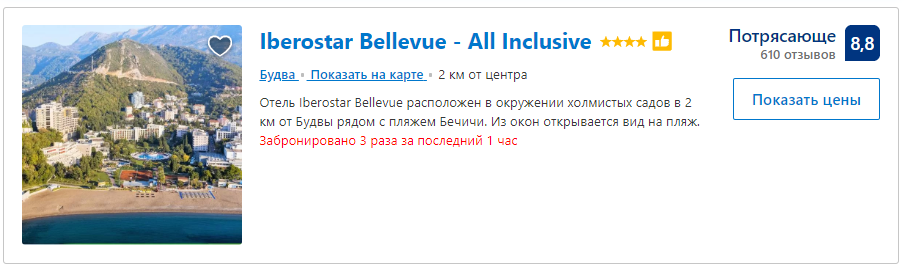 | Iberostar Bellevue 4* | Becici b.b, г. Будва | Всего 573 номера. Есть 3 ресторана, 7 баров, теннисные корты, SPA и 2 бассейна. Активная анимация для детей и взрослых. | 21313 руб. |