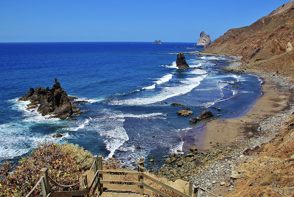 Широкая пляжная полоса в километр длиной, тихий шелест океана, пышная зелень пальм и лазурная вода с прозрачным дном – самый раскрученный участок Тенерифе словно сошел с картинки Мальдив. Немногие знают, что эта красота – результат кропотливого труда, начатого в 70-е годы XX века. В результате трансформаций поверх черного вулканического песка был насыпан мягкий золотистый, привезенный из Сахары, были установлены пирсы и волнорезы, предохраняющие от штормов и высоких волн, открыто множество кафе. Расположенный в 7 км от Санта-Крус, этот отрезок берега любим столичными жителями, а также туристами, приезжающими посетить уникальные подводные палеонтологические раскопки, которые содержат окаменелости древних моллюсков высокой научной ценности.