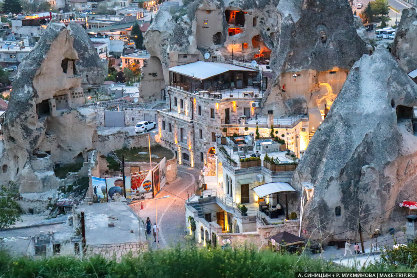 Вид со смотровой площадки в Гёреме на пещерные отели. Они красиво подсвечены ночью и напоминают светлячков.