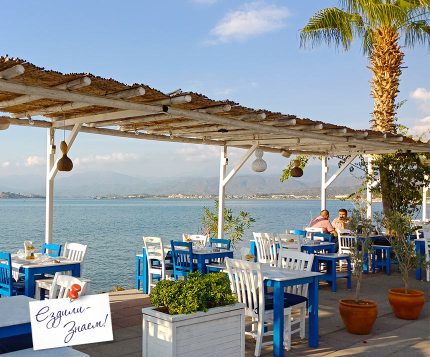 Главная кроется в его локации: построен в историческом месте – прямо напротив входа в ликийские гробницы. При этом на возвышенности, а это значит, что сидящие за столиками могут любоваться захватывающими видами города, бухты и горных хребтов. Зрелище потрясающее.