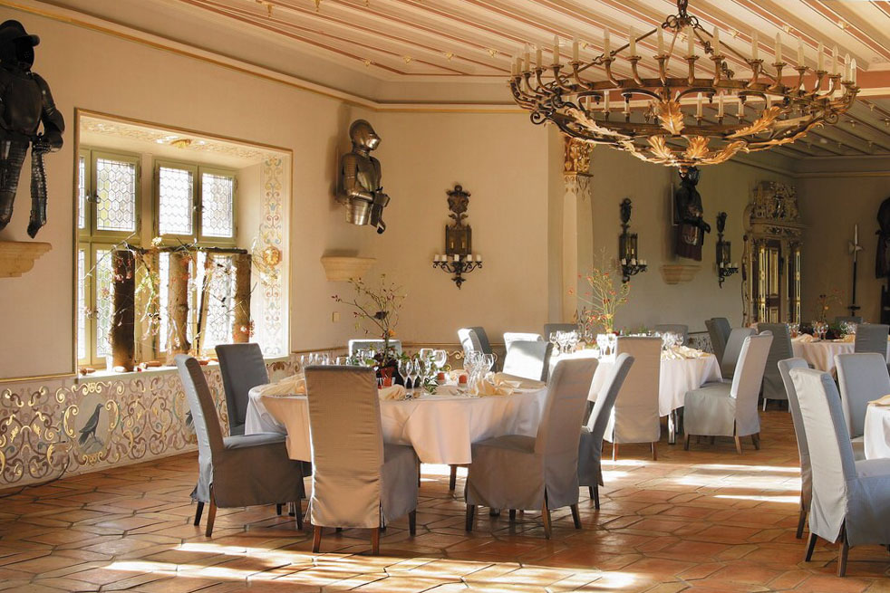 Ресторан Schlosskeller предлагает уникальное меню из классических блюд немецкой кухни, приготовленных по французским кулинарным технологиям. Вы будете обедать в сохранившихся дворцовых подвалах 16-го века, украшенных антиквариатом и старинной мебелью.