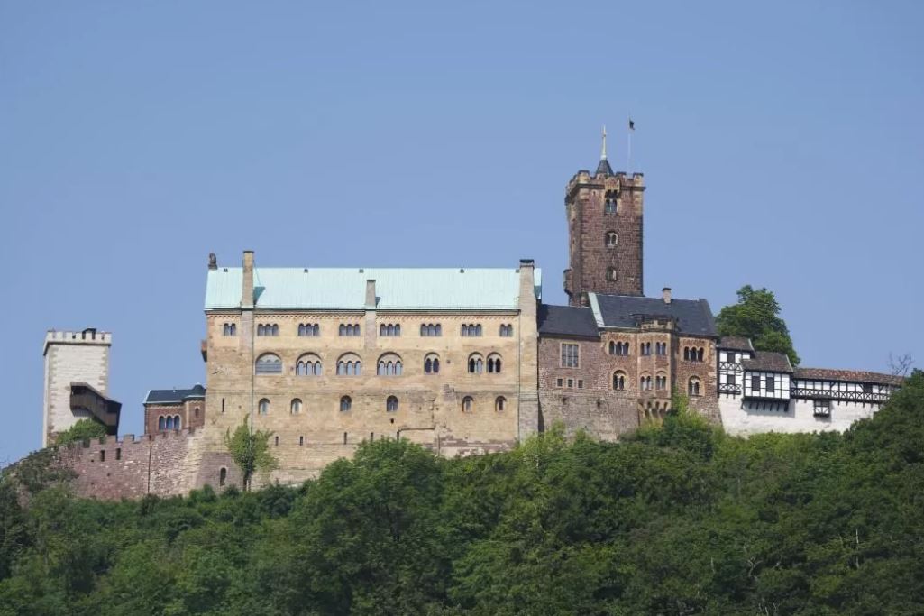 Это историческая Германия, и замок Вартбург восходит к 1067 году, когда он был построен на вершине самого известного холма в регионе. Айзенах, расположенный далеко внизу, в последующие века прославился как город, где Мартин Лютер впервые перевел Библию на немецкий язык, а также это место рождения знаменитого немецкого композитора Баха.
