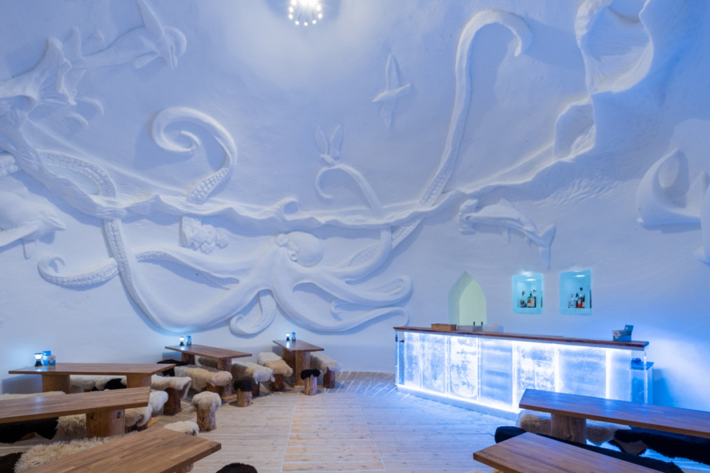 В деревне иглу также есть сауна и бар, полностью сделанный изо льда.