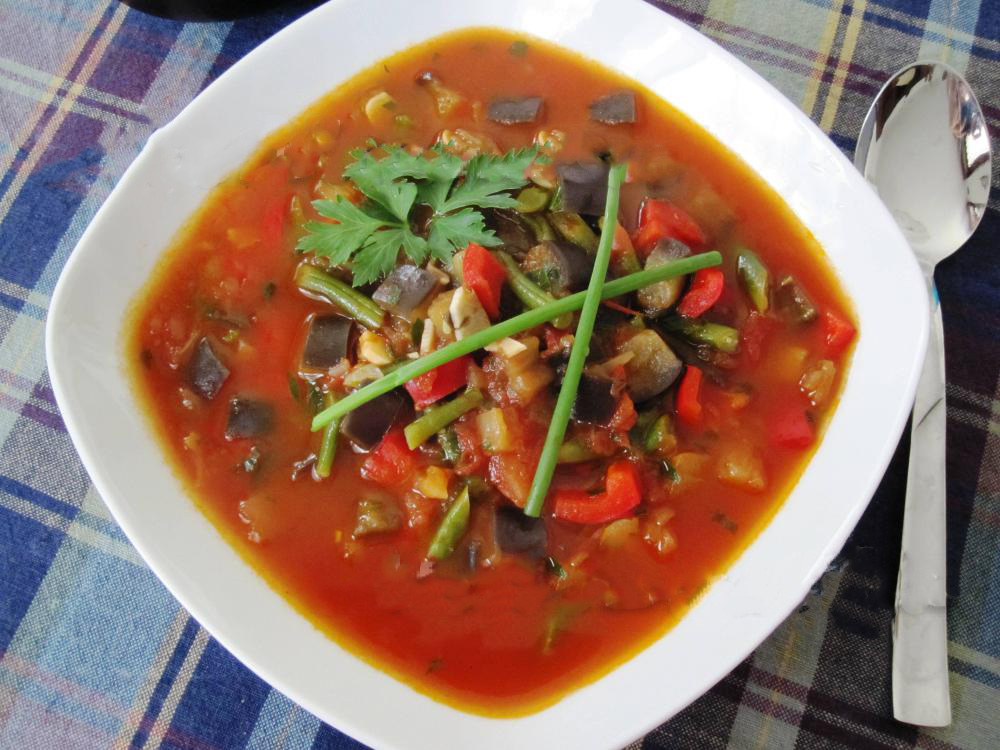 В кипящий суп добавить нарезанные баклажаны, помидоры, сладкий перец, фасоль и варить до готовности. В конце варки добавить измельчённую кинзу, толчёный чеснок и соль.
