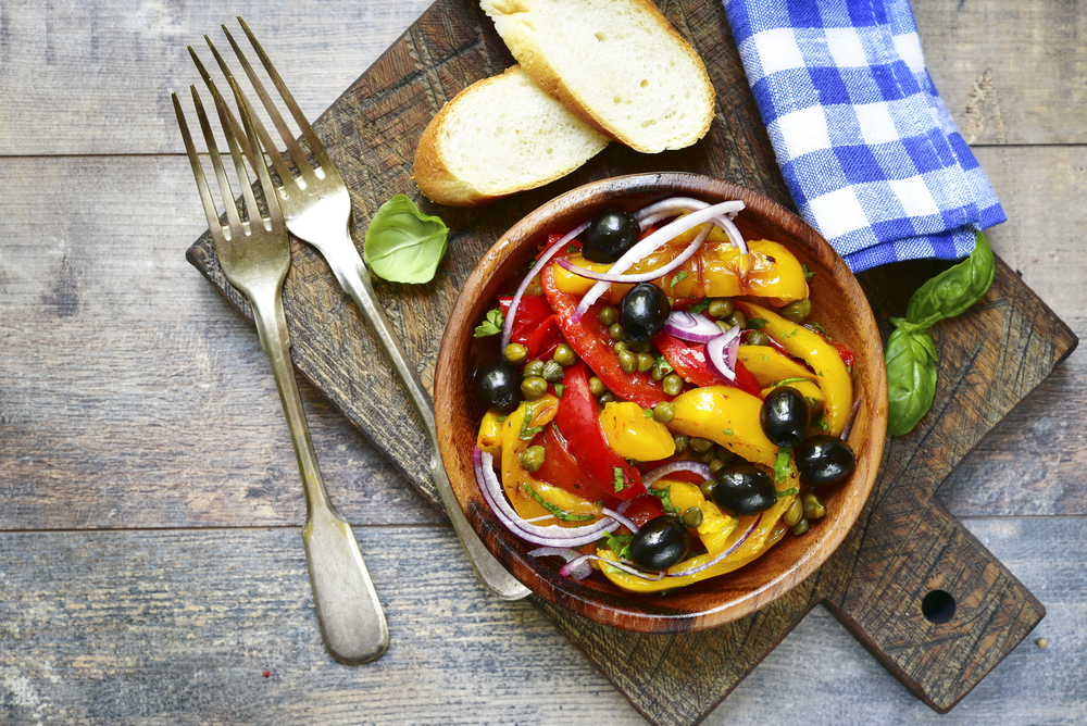 - Убрать фольгу, хорошенько перемешать овощи, увеличить температуру в духовке до 210 градусов и готовить пеперонату еще 15 минут до появления приятного румяного оттенка.