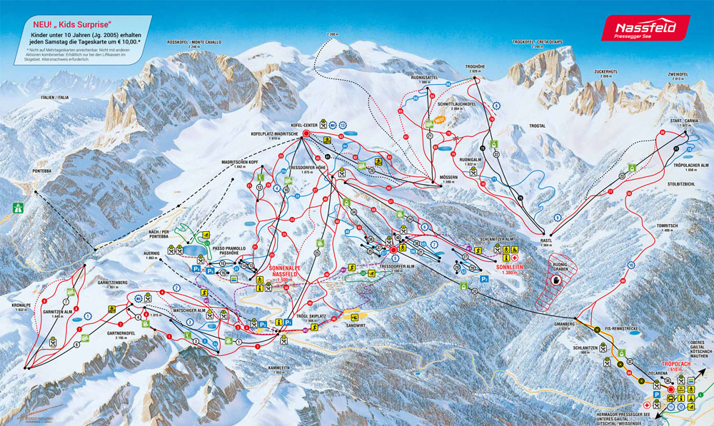 Среди главных преимуществ курорта Насфельд – гарантированное обилие снега, превосходное качество трасс и очень удобное расположение отелей и апартаментов, позволяющее кататься, что называется, «от дверей». На склонах Насфельда общей протяженностью около 100 км хватит места и новичкам, и профессионалам. Интересно, что именно в Насфельде действует самый длинный в Альпах гондольный подъемник, доставляющий лыжников к началу трасс на расстояние более 6 км. Еще одной изюминкой курорта является горное озеро Пресеггер, которое после замерзания превращается в огромный естественный ледовый каток.