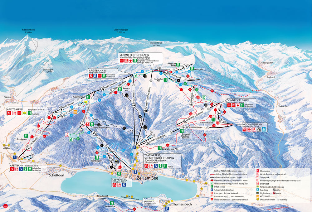 Особенность местной географии — почти все трассы начинаются на высоте 2000 метров с одной и той же вершины с сложнопроизносимым названием Schmittenhohe.