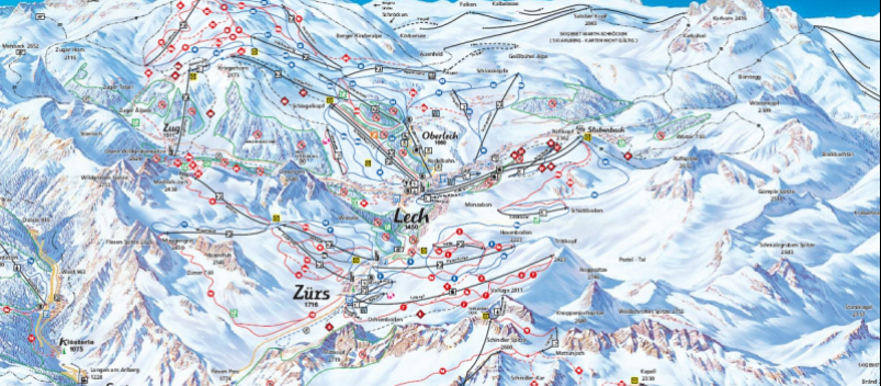 Зона катания расположена на высоте от 1450 до 2450 м., добраться к местам стартов можно с помощью 97 подъемников региона Арльберг, которые способны перевозить более 115 тыс. пассажиров в течение каждого часа. Более полусотни маркированных трасс протянулись на 110 км, немаркированные составляют еще примерно столько же. Около половины всех спусков промаркировано красным, для новичков предназначена примерно треть всех дистанций, и 22 км. трасс Леха – вотчина очень опытных спортсменов.