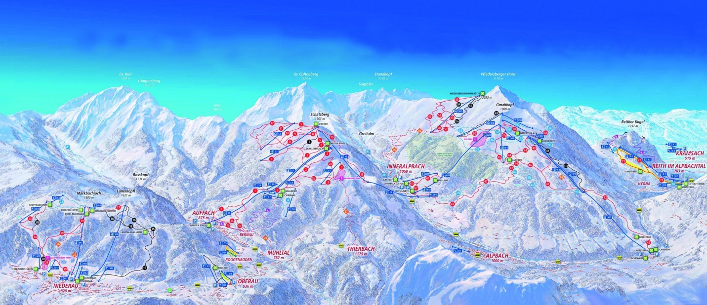 Почти 32 км занимают синие спуски на курорте, под красные трассы отведено 78 км, а черные склоны тянутся на 18 км на Альпбах-Вильдшенау. Главные вершины курорта: Шатцберг и Видерсбергхорн. Высота первого пика составляет 1903 метра, второго – 2128 метров.