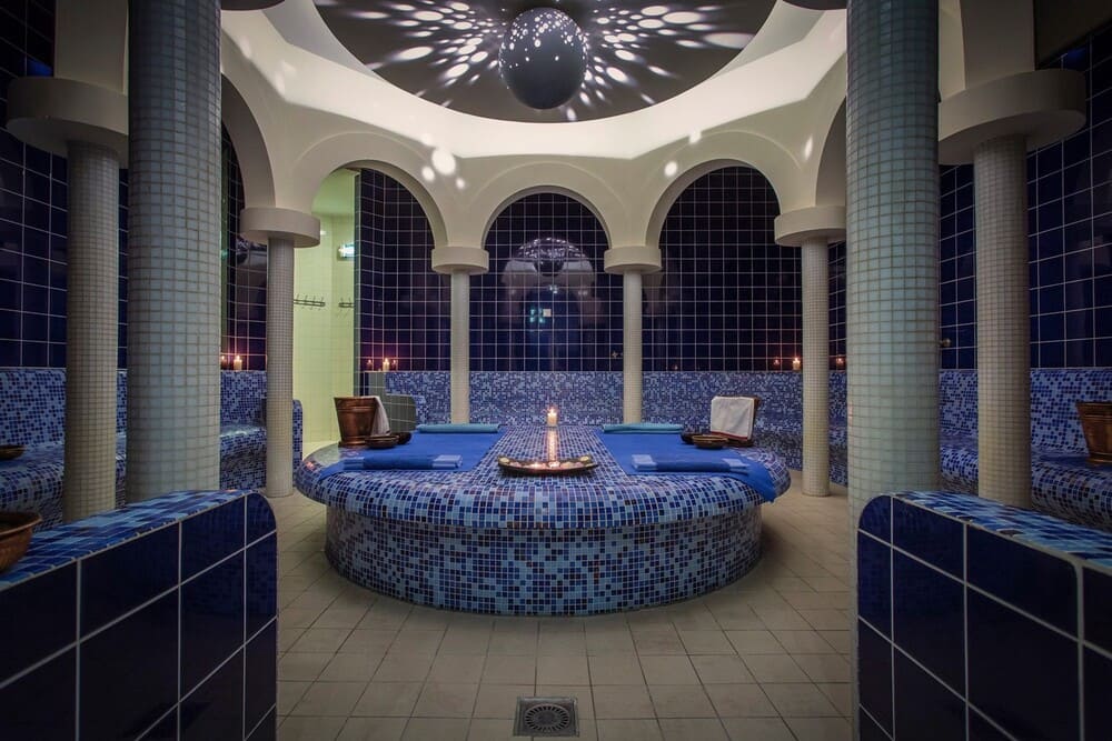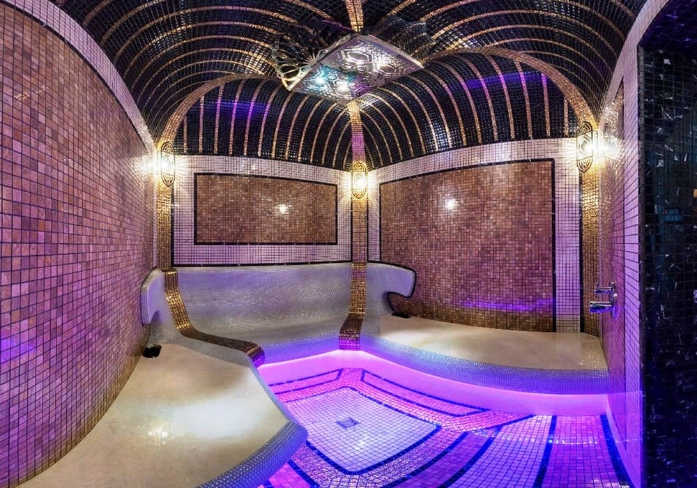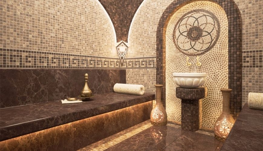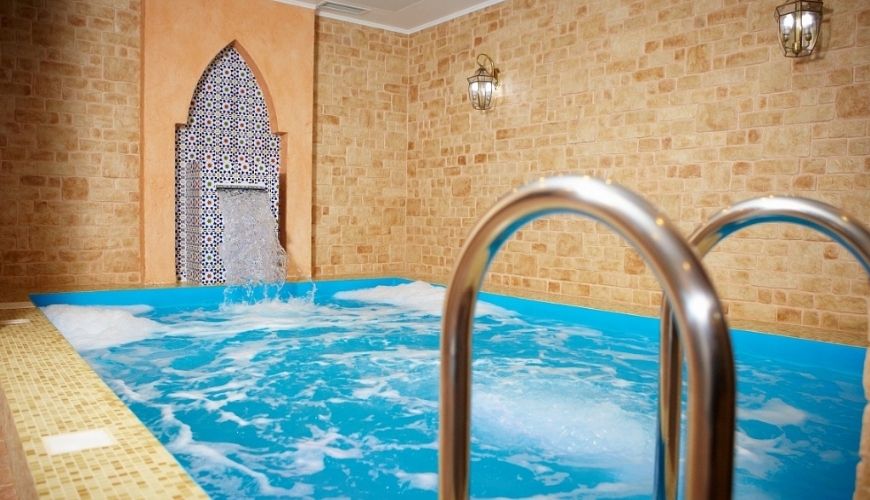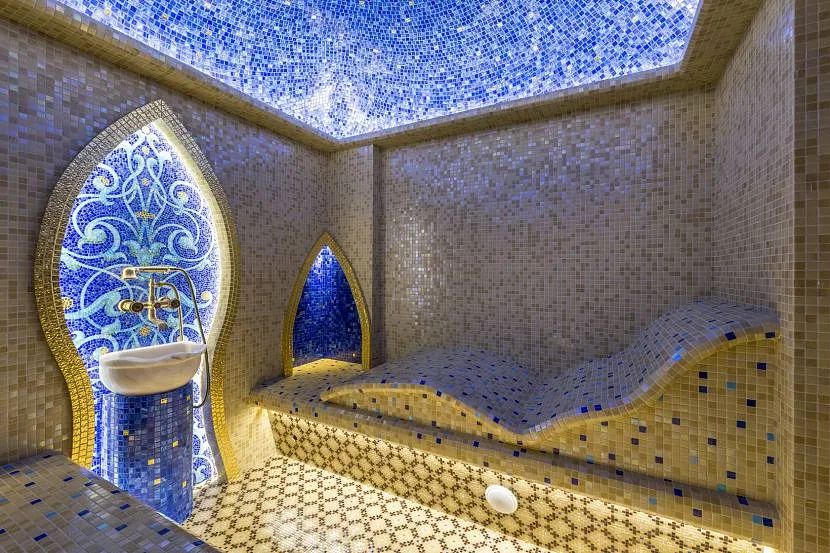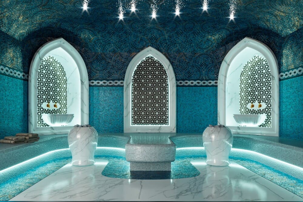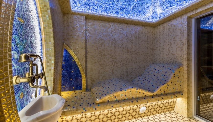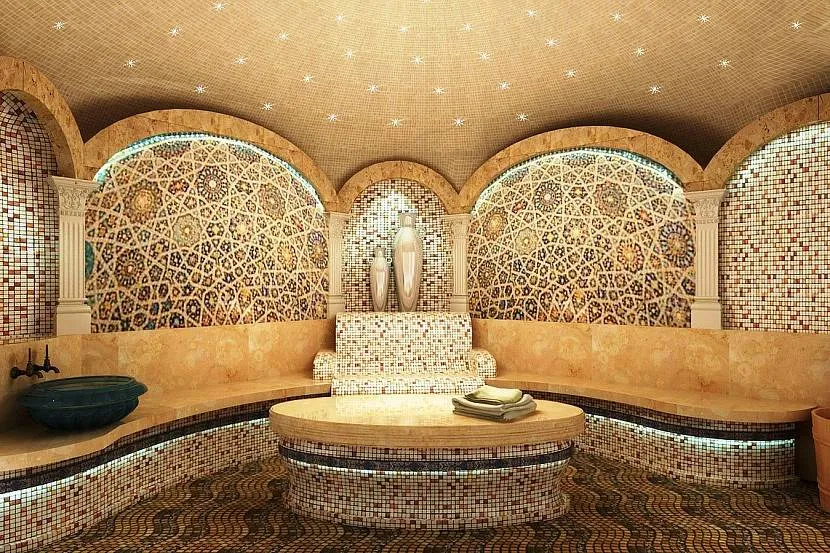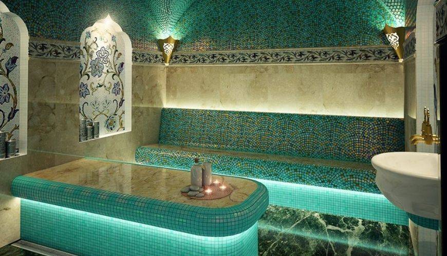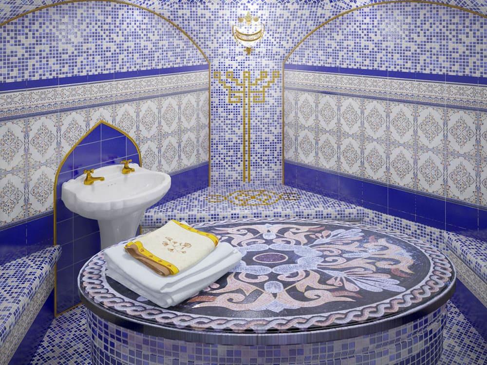 В хамаме размещают бассейны и водопады с разной температурой воды. Это укрепляет организм и способствует его полноценному отдыху.