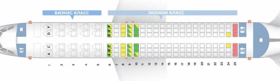 С 1 по 5 (или 1-2) ряды отводятся для пассажиров бизнес-класса, по 2 кресла с каждой стороны от прохода.