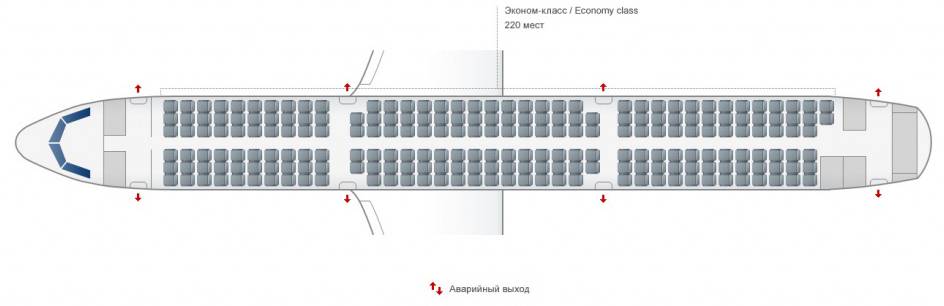 - Эконом-класс — 142 места на рядах 8-31 (по схеме 3-3, кроме 19-го ряда — там 2-2);
