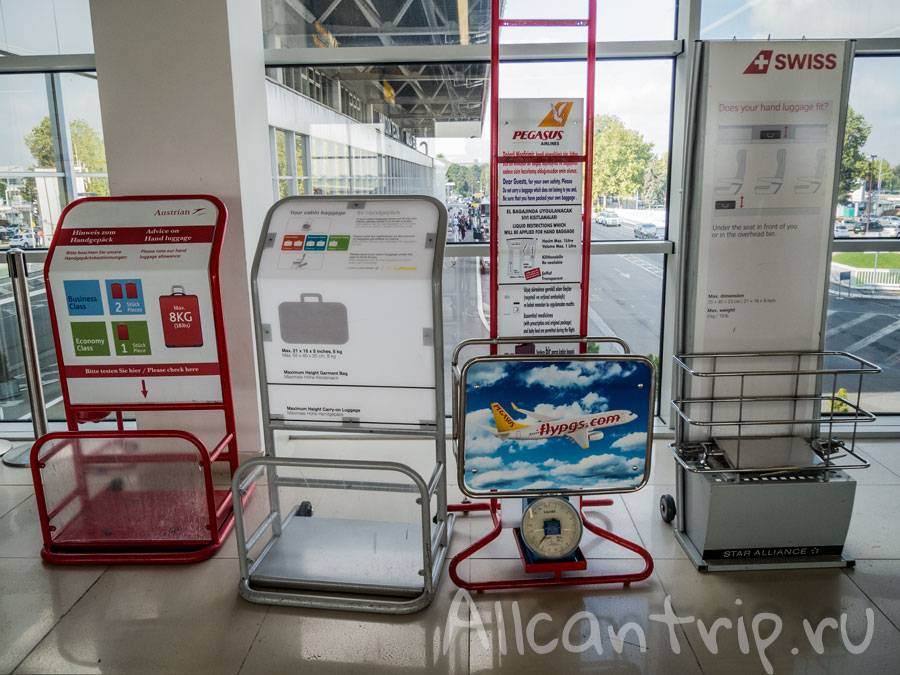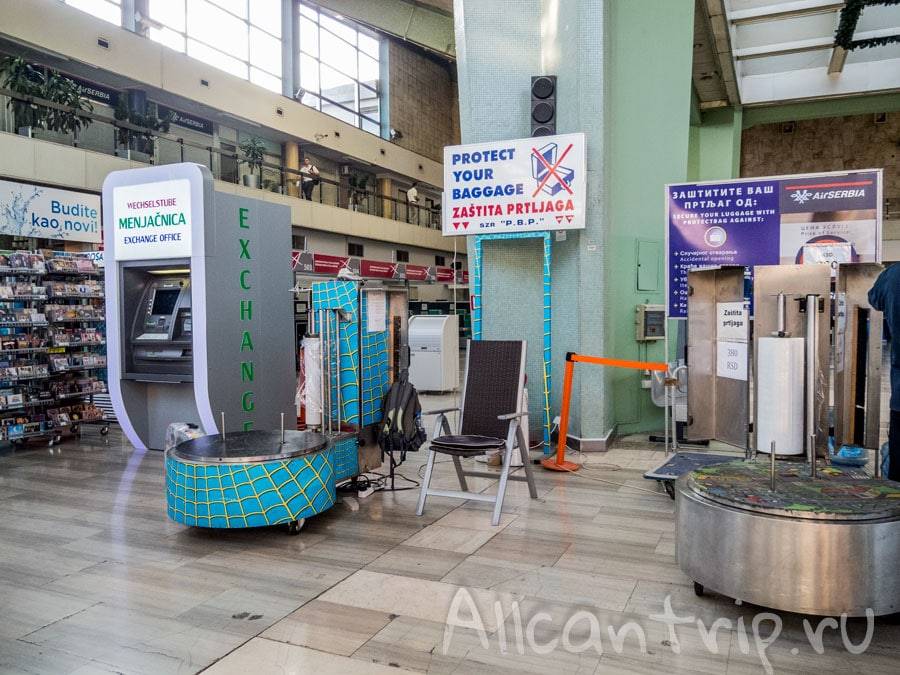 При входе в терминал расположены напольные весы для проверки, нет ли превышения нормы. Можно что-то переложить и упаковать багаж. Услуга стоит 450 динар (279 руб.), доступна с 04-30 до 18-00.