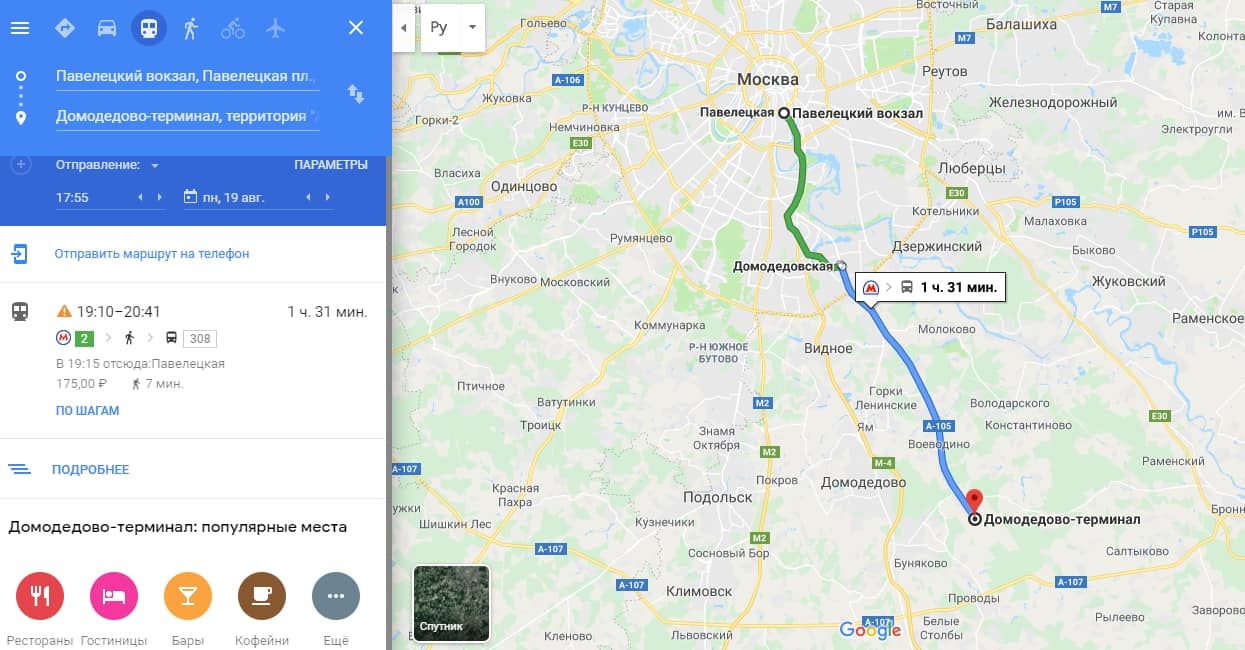 Электричка — бюджетный способ добраться в аэропорт Домодедово. По времени путь дольше, чем на аэроэкспрессе, зато в 4 раза дешевле. Отправляется электричка от того же Павелецкого вокзала. А если сеть на электричку от станции метро «Нагатинская», то проезд будет стоить 88 руб., время до аэропорта 55 минут.