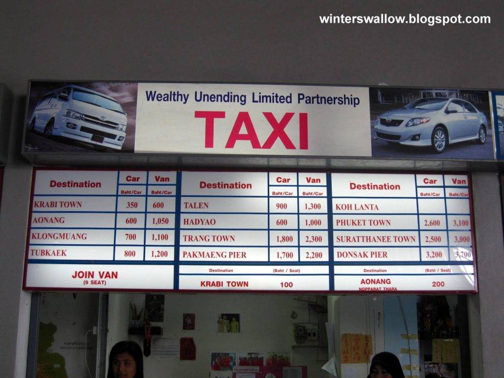 - Более удобный способ, а иногда и единственный, если ваш рейс пребывает рано утром или поздно вечером, – это поездка на такси. В аэропорту Краби нет «частников» – машины предоставляют только официально сотрудничающие с аэропортом компании, все тарифы фиксированы, а оплачивать поездку нужно на специальной стойке в аэропорту. Машины такси здесь представлены двух видов: обычные автомобили и микроавтобусы, рассчитанные на большую компанию из 8 человек. В этом случае, если вы путешествуете семьей или группой, поездка на такси будет не только комфортнее и быстрее общественного транспорта, но еще и дешевле. Поездка до центра Краби обойдется в 350/600 бат за машину (обычную или микроавтобус), а до Ао Нанга – 600/1050. На такси можно добраться и до других ближайших (и не очень) городов и курортов провинции. Например, поездка до расположенного чуть дальше Ао Нанга поселка и пляжа Клонг-Муянг будет стоить 800/1200 бат, а такси до Пхукета – 2600/3100 бат. Кстати, несмотря на, казалось бы, довольно большую удаленность, до этого города из аэропорта Краби можно добраться относительно быстро – за 2,5-3 часа. Дорога на машине до центра Краби и до Ао Нанга (он находится в 28 км от аэродрома) займет 15 и 30 минут соответственно.