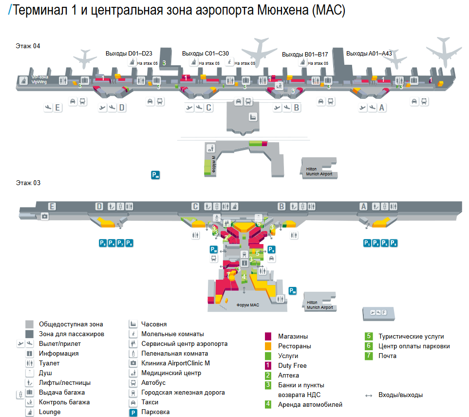 Схема терминалов аэропорта Мюнхена поможет вам понять, что тут есть все для пассажиров — от комнаты матери и ребенка до многочисленных кафе и ресторанов на любой бюджет.