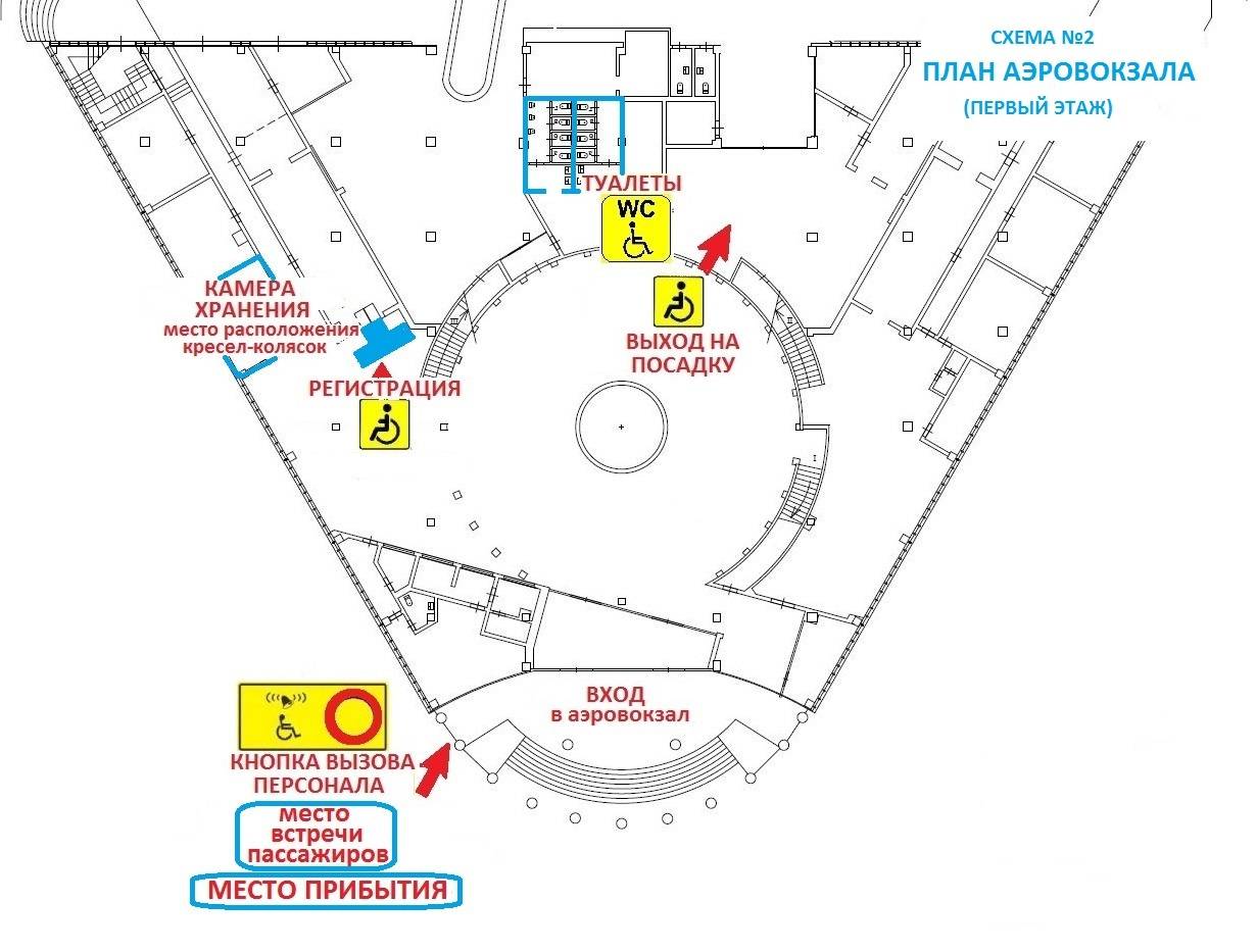 Чтобы попасть в аэропорт пассажиры с ограниченными возможностями могут просто нажать на кнопку вызова сотрудника, который поможет подняться в здание аэровокзала. Вход оборудован специальными пандусами для инвалидов-колясочников. Сопровождающие помогут пройти регистрацию на рейс и пункт досмотра. В перронных автобусах для тех, кто не может ходить самостоятельно, предусмотрено кресло у входа.