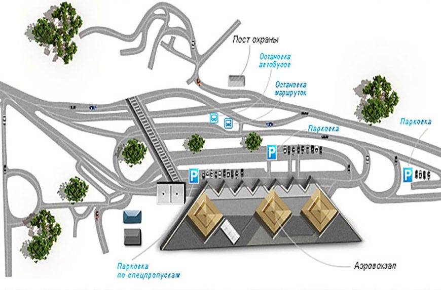 На привокзальной площади и возле VIP-терминала располагается широкая парковочная зона на 900 машиномест. Стоимость парковки зависит от расположения места и удаленности его от терминала