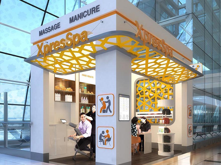 - XpresSPA, на фото один из их реальных павильонов в аэропорту. Цена зависит от времени. Их павильоны тоже находятся в 3-терминале, в зале B.