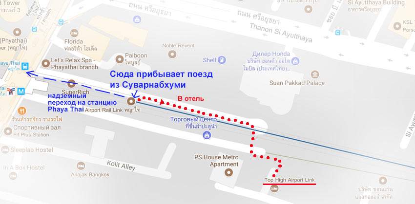 Где лучше остановиться? Выдаю свой лайфхак: бюджетный отель Top High Airport Link Hotel – отличная перевалочная база между двумя аэропортами Бангкока. Со станции до отеля – пешком метров 50 (сразу от станции надо перейти ж/д пути). По приезду спускайтесь на один уровень с платформы. Вся толпа двинется по переходу на зеленую линию, – вам же нужно пойти в обратном направлении и спуститься по лестнице на улицу. Дальше – согласно схеме.