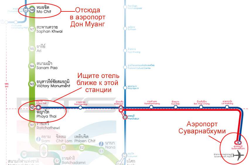До северного автовокзала «Мо Чит» (Mo Chit) также нужно сперва доехать до станции «Phaya Thai», а после на метро добраться до станции «BTS Sukhumvit».