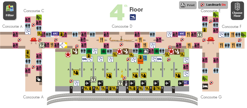 Суварнабхуми – третий по величине аэропорт в мире, площадью в 563 000 кв.м. Но заблудиться в нем почти невозможно, так как он разбит по этажам на удобные зоны. Всего 4 этажа и 1 подземный уровень, обозначенный буквой В.