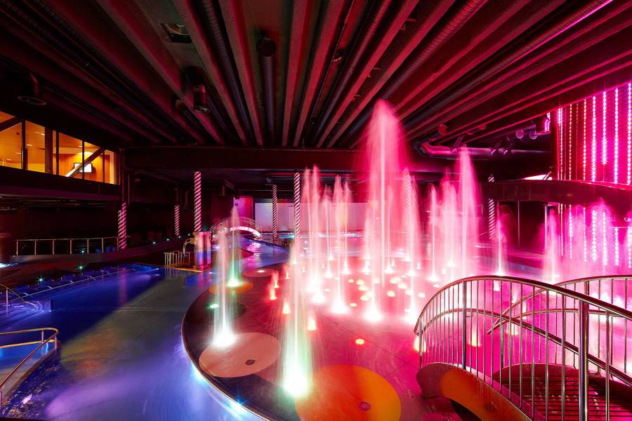 - Танцующие фонтаны с подсветкой. Очень красивое зрелище, которое является несомненным гвоздем программы аттракционов в аквапарке. Дети будут в восторге и обязательно оценят возможность побегать от внезапно выстреливающих струй.