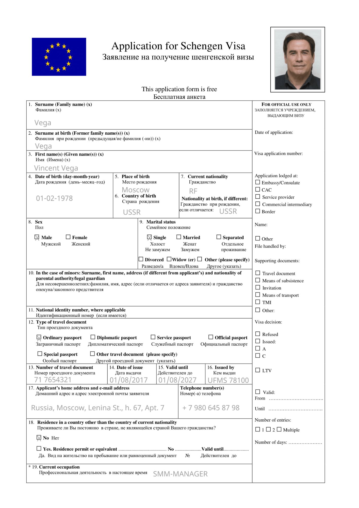- П. 5 — место рождения может быть написано на английском или русском языке, но латинскими буквами (например, Volgograd region или Volgogradskaya obl.);