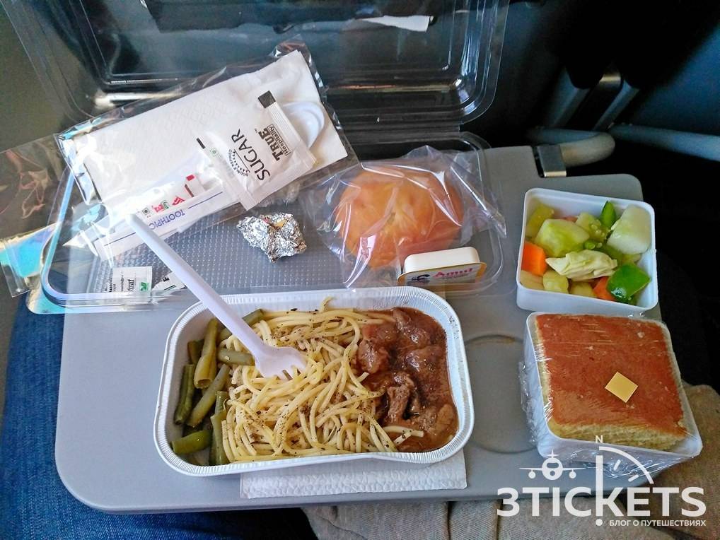 В полете стюардессы подают не только еду и напитки, но и леденцы от укачивания. Такой сервис свидетельствует о заботе. Если самолет летит днем, то будет трехразовое питание, при полете ночью, только напитки или еда по требованию. С утра дают булочку, колбасу, сыр, масло, чай, кофе. Днем и вечером горячее. Помимо чая и кофе дают воду и сок.