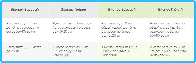Тариф Эконом базовый не включает бесплатный провоз багажа. Эконом гибкий позволяет провозить 23 кг регистрируемого багажа на пассажира. Бизнес базовый – 32 кг, а Бизнес гибкий – 2 места багажа по 32 кг каждое. Размер каждого места не должен превышать 203 см в сумме трех измерений.