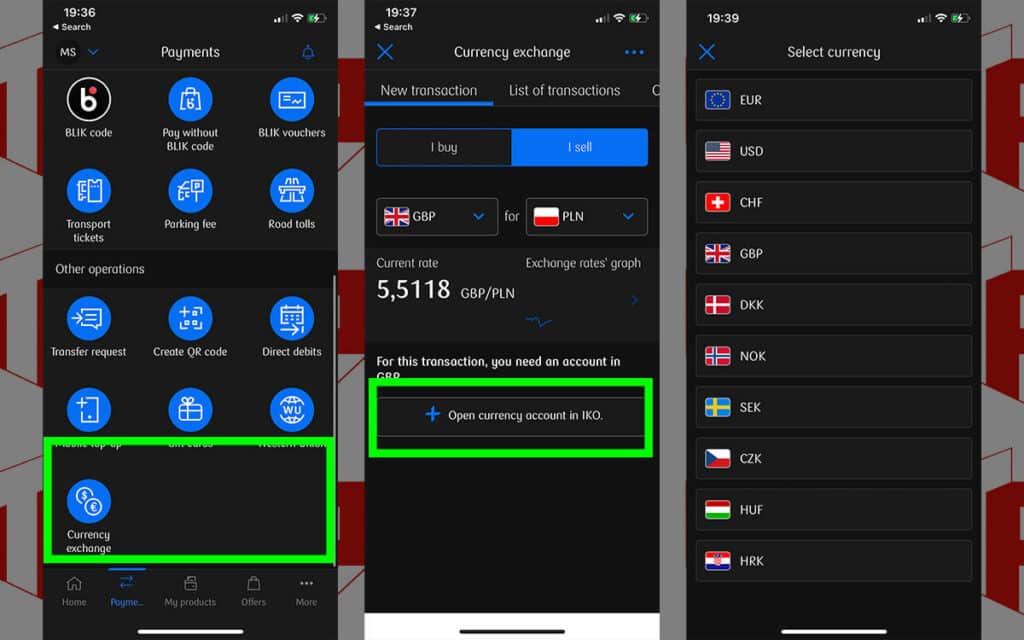 Валютные счета (доллары, евро): Аналогично счету в польских злотых — комиссия за открытие счета и его обслуживание не предусмотрено. Комиссии за обслуживание банковской карты также аннулируются при активном использовании карты для оплат в магазинах или в интернете (не менее 4-5 операций на сумму от 80 Евро в месяц).
