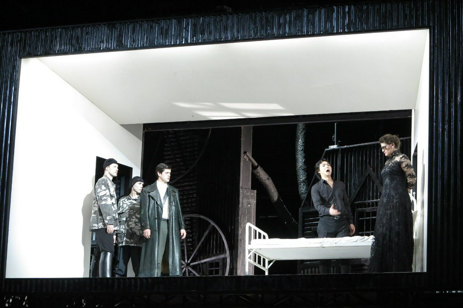 Все три действия происходят в таких сценических руинах. Как поясняется постановщиками, действие оперы перенесено в США в шестидесятые годы, прототип Лючии – Жаклин Кеннеди, Эдгар – Джеймс Дин. На протяжении всего действия в обиходе главных героев довольно много оружия, мне лично аналогия с Кеннеди показалась достаточно натянутой: скорее создавалось впечатление гангстерской драмы с враждующими двумя кланами и с преобладанием жестокой патриархальности. Именно такому миру пытается противопоставить себя Лючия, но, в итоге, находит свою свободу в безумии и смерти.