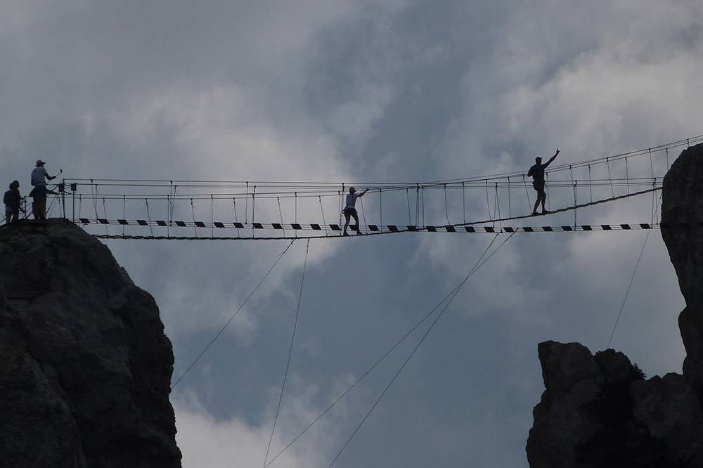 На фото хорошо виден угол подъема веревочного моста на зубцах Ай-Петри