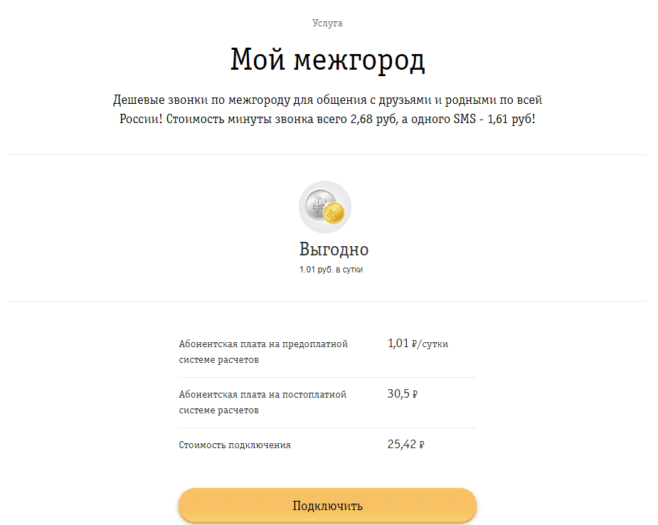 - звонки на междугородние номера Билайн — 0,25 руб. в минуту;