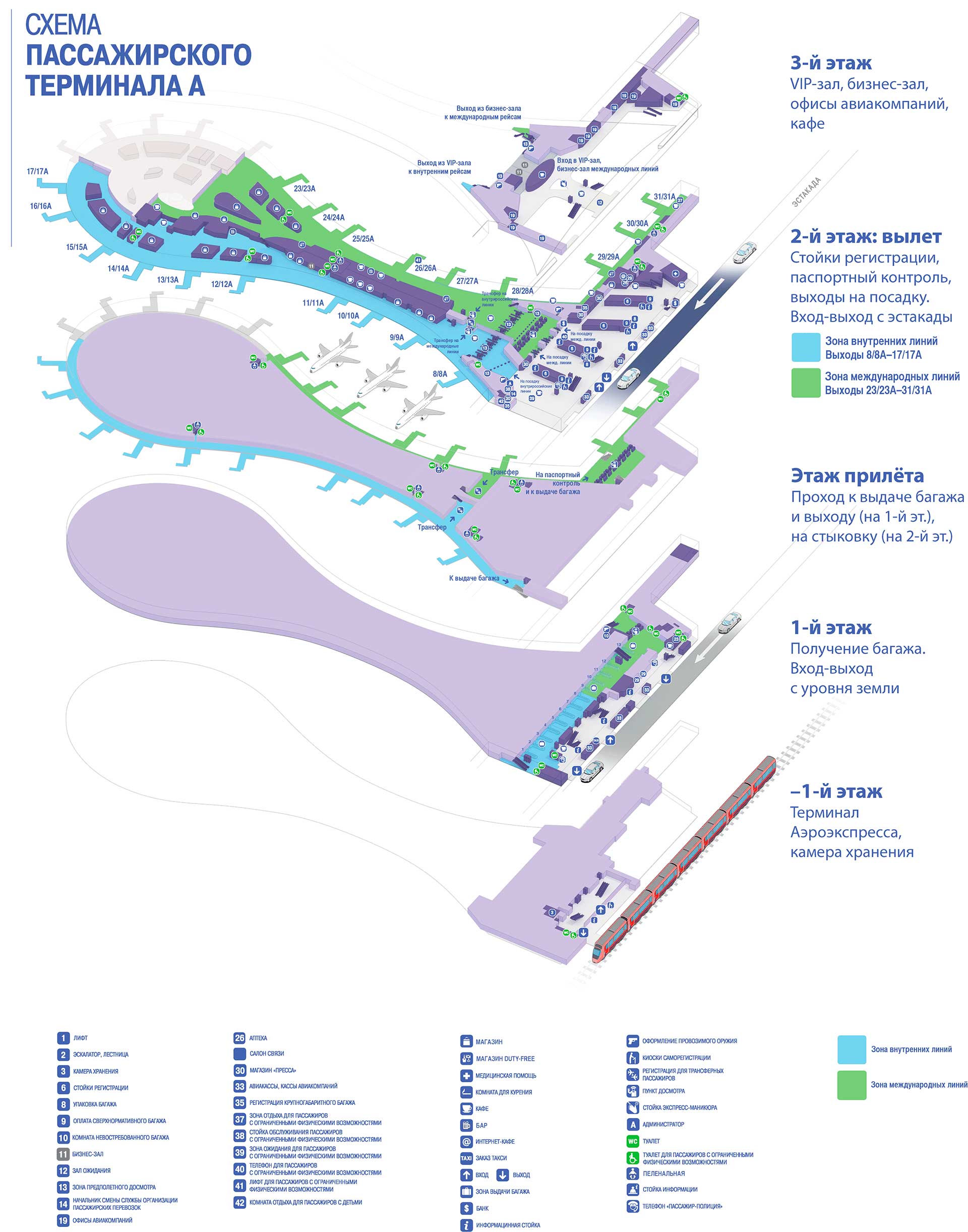 Для прохода в терминал А выходить на улицу не нужно, вход в терминал — через подземный уровень.