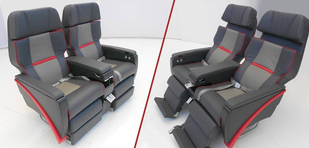 Первый ряд – это места бизнес-класса. Тут сидения расположены попарно, увеличено расстояние между сидениями. Спинки могут откидываться больше, а для ног предоставлено дополнительное пространство. Сами кресла тут более удобные, чем в другом классе. Выглядят они примерно как на фото: