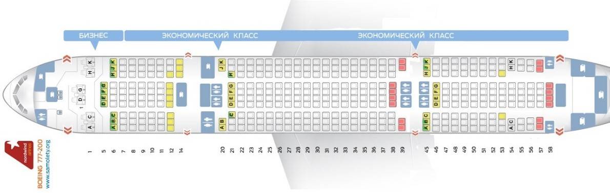 Боинг 777-200 Норд Винд схема салона выглядит следующим образом — Boeing 777-200ER разработан по уникальному стилю. Boeing Signature Interior создан по специальному выпуску с большими полками для багажа. В салоне установлено непрямое освещение. Ширина салона (5,87 метров) позволяет вместить в ряд до 10 кресел. Размер иллюминаторов — 380×250 мм.
