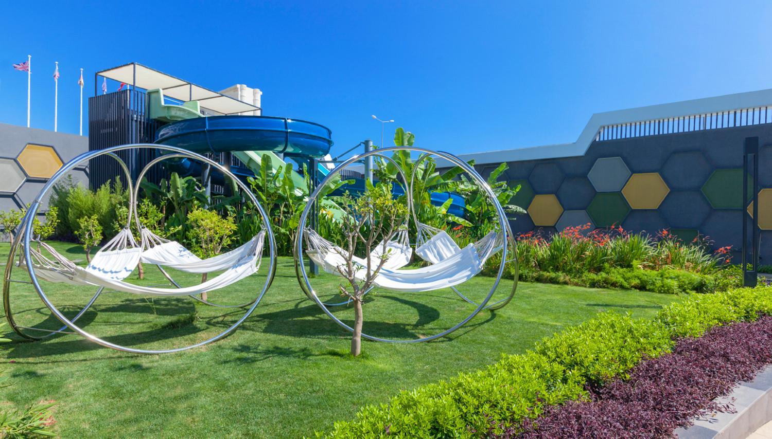 Отдельное внимание владельцами комплекса уделено ландшафтному дизайну территории. Везде находятся зеленые сады, интересные экспозиции из живых цветов и растений с подсветкой