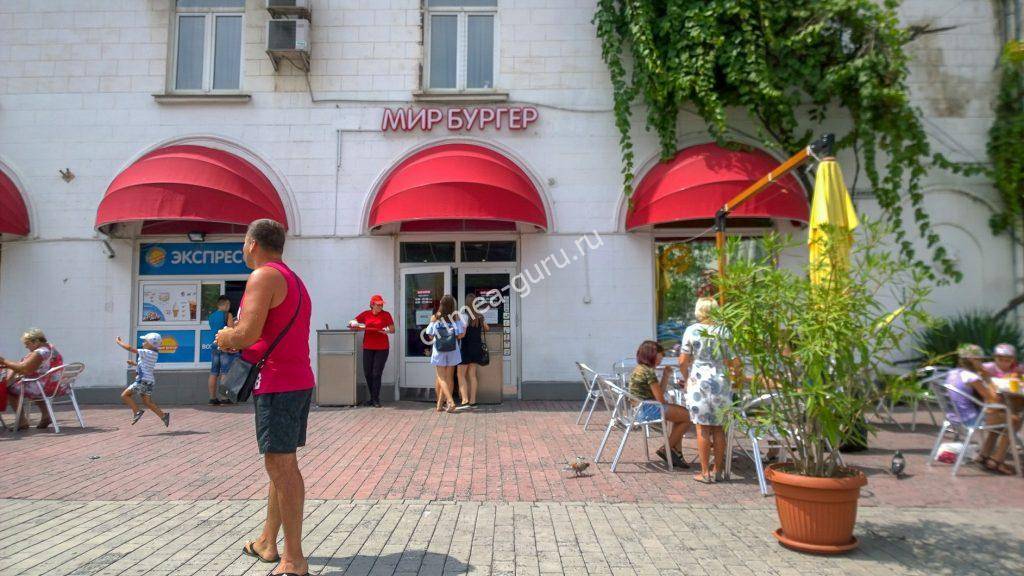 Когда гуляли по городу, сложилось чувство, что Севастополь — город фастфуда:) Или мы прошлись по улице, где продавались одни бургеры:) НА самом деле кафе и столовых в Севастополе полно. Поэтому во время отдыха с детьми там можно найти, где поесть вкусно и недорого, а может и дорого