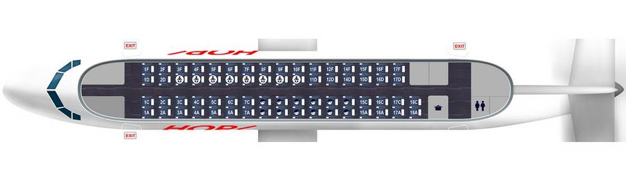 Салон Atr 72 снабжен кухней и туалетами, находящимися возле 17 и 18 ряда, поэтому эти места не самые лучшие, так как мимо сидящих постоянно будут ходить стюардессы и пассажиры, создавая очередь, толкаясь и разговаривая, отвлекая от отдыха во время полета.