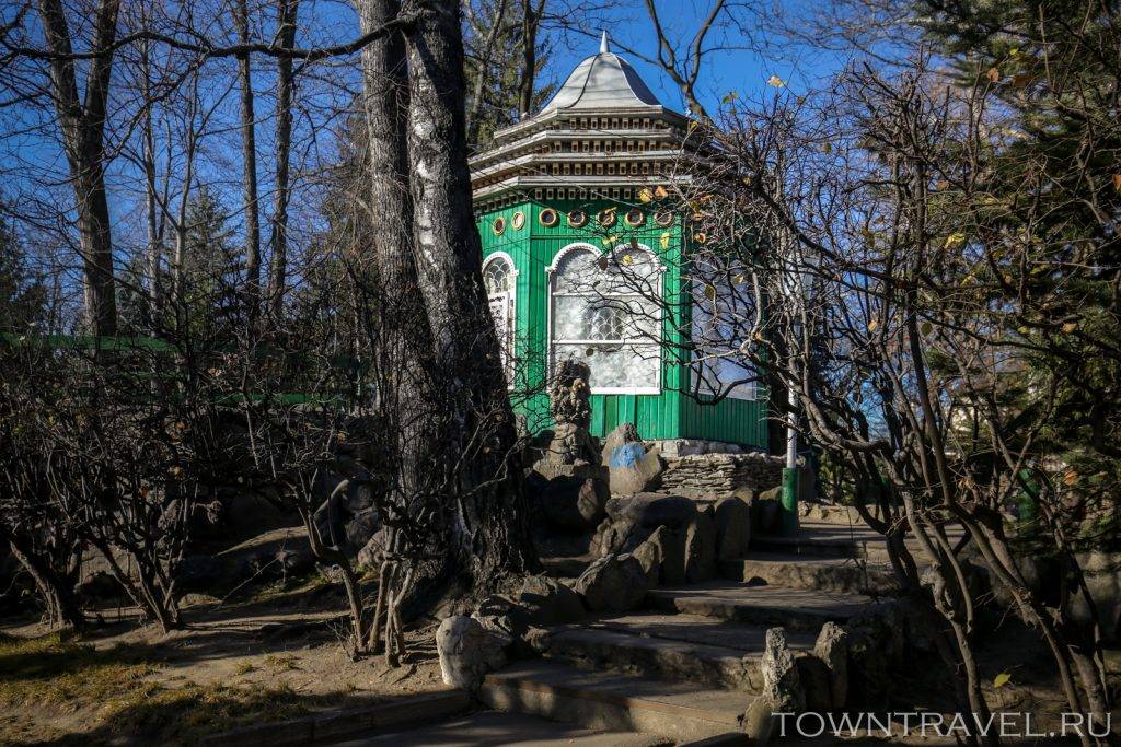 В парке сохранилось несколько очень симпатичных деревянных построек. Например, вот эта чудесная беседка с китайскими мотивами.