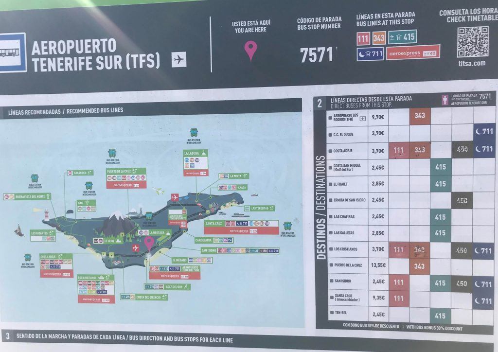 Основной общественный транспорт на Тенерифе — это автобусы Titsa. Стоимость билета на одну поездку зависит от расстояния (от 1.45€ до 9.7€). Точную стоимость можно рассчитать на сайте автобусной компании Titsa. Можно приобрести карту Bono (стоит 2 евро), которая позволит сэкономить на поездках 30%.