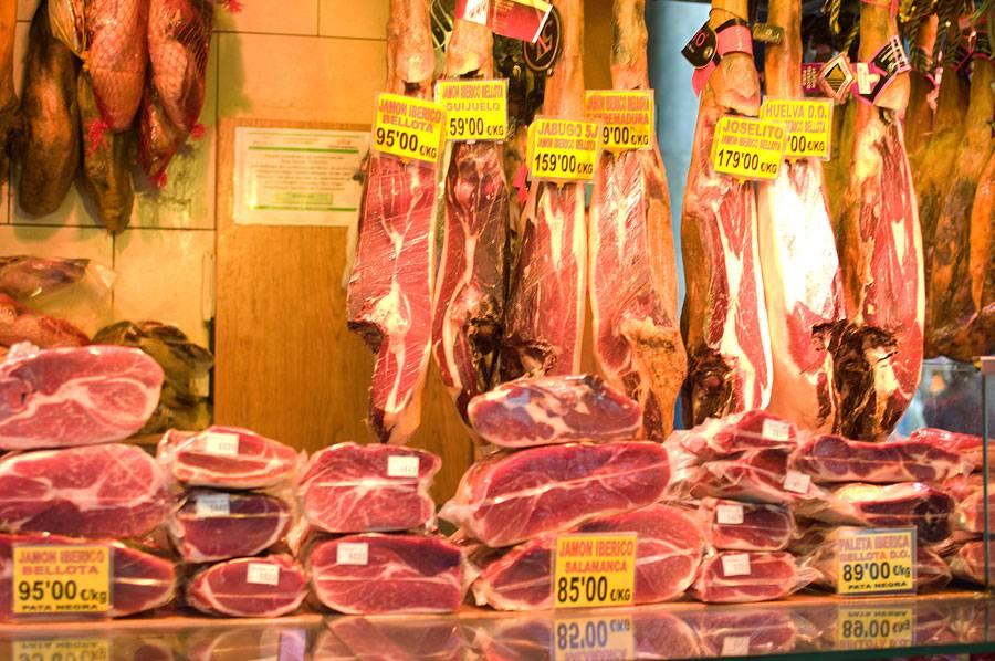 2) Хамон. Быть в Испании и не привезти хамон — это преступление. Хомон — это сыровяленный окорок. Существует два его вида — иберико и серрано.
