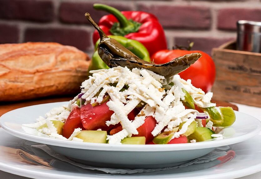 - Шопска (Шопский). Самый популярный болгарский салат, который во многом похож на греческий, но все же отличается от него. Огурцы, помидоры, много сладкого перца и еще больше солоноватой нежной брынзы – свежо и вкусно.